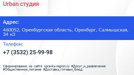 Urban, студия по адресу 460052, Оренбургская область, Оренбург, Салмышская, 34 к3 в дальнейшем Организация, размещена в следующих категориях: