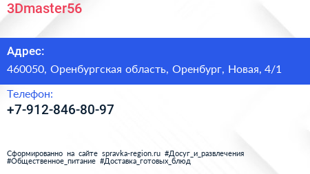 3Dmaster56 по адресу 460050, Оренбургская область, Оренбург, Новая, 4/1 в дальнейшем Организация, размещена в следующих категориях: