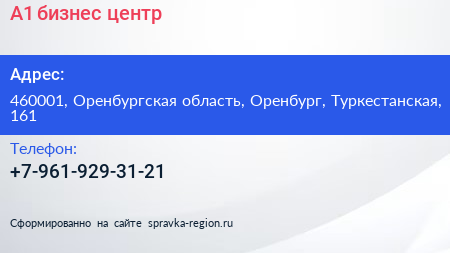 А1, бизнес-центр по адресу 460001, Оренбургская область, Оренбург, Туркестанская, 161 в дальнейшем Организация, размещена в следующих категориях: