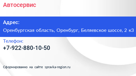 Автосервис по адресу Оренбургская область, Оренбург, Беляевское шоссе, 2 к3 в дальнейшем Организация, размещена в следующих категориях: