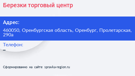Березки, торговый центр по адресу 460050, Оренбургская область, Оренбург, Пролетарская, 290а в дальнейшем Организация, размещена в следующих категориях: