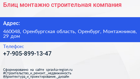 Блиц, монтажно-строительная компания по адресу 460048, Оренбургская область, Оренбург, Монтажников, 29 дом в дальнейшем Организация, размещена в следующих категориях: