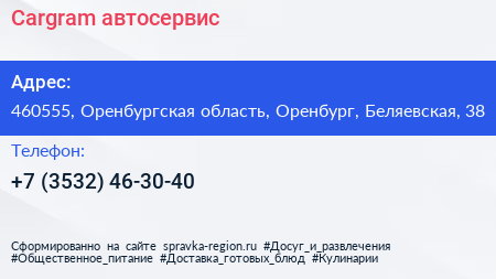 Cargram, автосервис по адресу 460555, Оренбургская область, Оренбург, Беляевская, 38 в дальнейшем Организация, размещена в следующих категориях:
