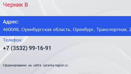 Черник-В по адресу 460048, Оренбургская область, Оренбург, Транспортная, 2 в дальнейшем Организация, размещена в следующих категориях:
