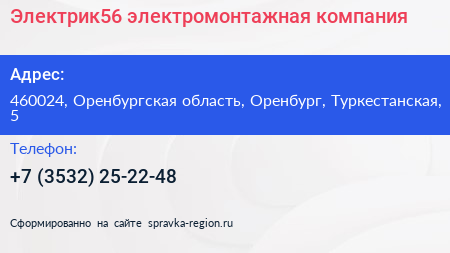 Электрик56, электромонтажная компания по адресу 460024, Оренбургская область, Оренбург, Туркестанская, 5 в дальнейшем Организация, размещена в следующих категориях: