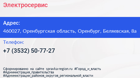 Электросервис по адресу 460027, Оренбургская область, Оренбург, Беляевская, 8а в дальнейшем Организация, размещена в следующих категориях: