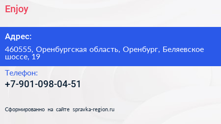 Enjoy! по адресу 460555, Оренбургская область, Оренбург, Беляевское шоссе, 19 в дальнейшем Организация, размещена в следующих категориях: