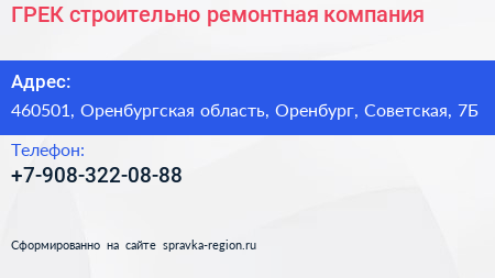 ГРЕК, строительно-ремонтная компания по адресу 460501, Оренбургская область, Оренбург, Советская, 7Б в дальнейшем Организация, размещена в следующих категориях: