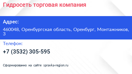 Гидросеть, торговая компания по адресу 460048, Оренбургская область, Оренбург, Монтажников, 3 в дальнейшем Организация, размещена в следующих категориях: