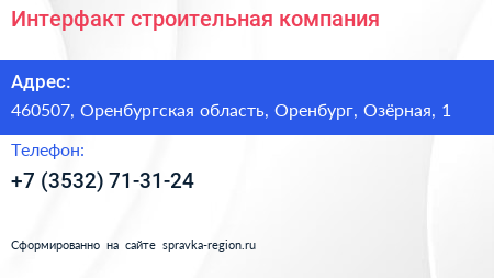 Интерфакт, строительная компания по адресу 460507, Оренбургская область, Оренбург, Озёрная, 1 в дальнейшем Организация, размещена в следующих категориях: