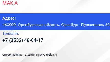 МАК-А по адресу 460000, Оренбургская область, Оренбург, Пушкинская, 63 в дальнейшем Организация, размещена в следующих категориях: