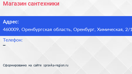 Магазин сантехники по адресу 460009, Оренбургская область, Оренбург, Химическая, 2/1 в дальнейшем Организация, размещена в следующих категориях: