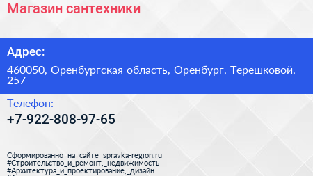 Магазин сантехники по адресу 460050, Оренбургская область, Оренбург, Терешковой, 257 в дальнейшем Организация, размещена в следующих категориях: