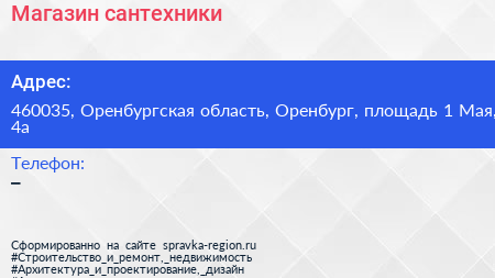Магазин сантехники по адресу 460035, Оренбургская область, Оренбург, площадь 1 Мая, 4а в дальнейшем Организация, размещена в следующих категориях: