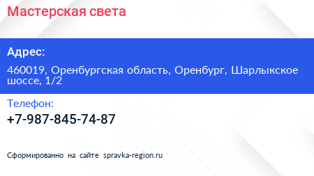 Мастерская света по адресу 460019, Оренбургская область, Оренбург, Шарлыкское шоссе, 1/2 в дальнейшем Организация, размещена в следующих категориях: