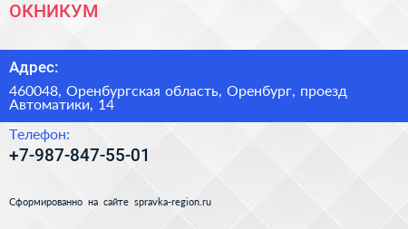 ОКНИКУМ по адресу 460048, Оренбургская область, Оренбург, проезд Автоматики, 14 в дальнейшем Организация, размещена в следующих категориях: