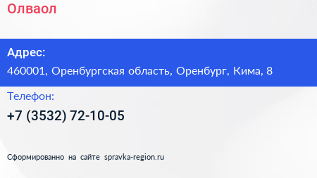 Олваол по адресу 460001, Оренбургская область, Оренбург, Кима, 8 в дальнейшем Организация, размещена в следующих категориях: