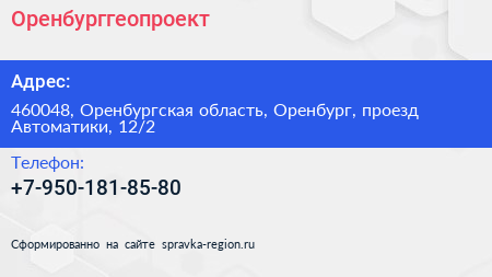 Оренбурггеопроект по адресу 460048, Оренбургская область, Оренбург, проезд Автоматики, 12/2 в дальнейшем Организация, размещена в следующих категориях: