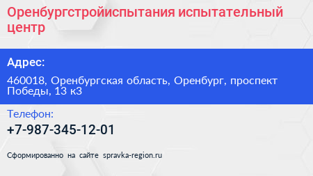 Оренбургстройиспытания, испытательный центр по адресу 460018, Оренбургская область, Оренбург, проспект Победы, 13 к3 в дальнейшем Организация, размещена в следующих категориях: