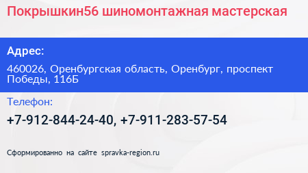 Покрышкин56, шиномонтажная мастерская по адресу 460026, Оренбургская область, Оренбург, проспект Победы, 116Б в дальнейшем Организация, размещена в следующих категориях: