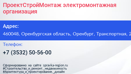 ПроектСтройМонтаж, электромонтажная организация по адресу 460048, Оренбургская область, Оренбург, Транспортная, 2 в дальнейшем Организация, размещена в следующих категориях: