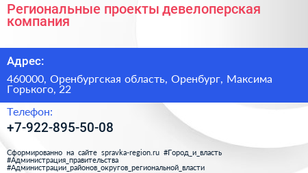 Региональные проекты, девелоперская компания по адресу 460000, Оренбургская область, Оренбург, Максима Горького, 22 в дальнейшем Организация, размещена в следующих категориях: