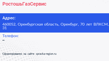 РостошьГазСервис по адресу 460052, Оренбургская область, Оренбург, 70 лет ВЛКСМ, 31 в дальнейшем Организация, размещена в следующих категориях: