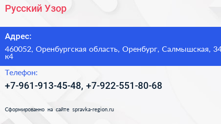 Русский Узор по адресу 460052, Оренбургская область, Оренбург, Салмышская, 34 к4 в дальнейшем Организация, размещена в следующих категориях: