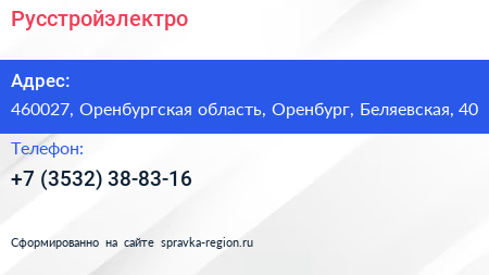 Русстройэлектро по адресу 460027, Оренбургская область, Оренбург, Беляевская, 40 в дальнейшем Организация, размещена в следующих категориях: