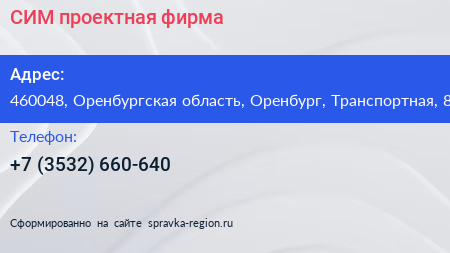СИМ, проектная фирма по адресу 460048, Оренбургская область, Оренбург, Транспортная, 8 в дальнейшем Организация, размещена в следующих категориях: