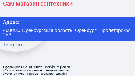 Сам, магазин сантехники по адресу 460050, Оренбургская область, Оренбург, Пролетарская, 269 в дальнейшем Организация, размещена в следующих категориях: