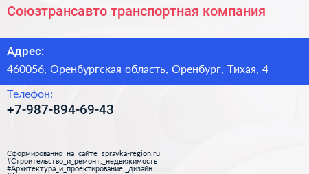 Союзтрансавто, транспортная компания по адресу 460056, Оренбургская область, Оренбург, Тихая, 4 в дальнейшем Организация, размещена в следующих категориях: