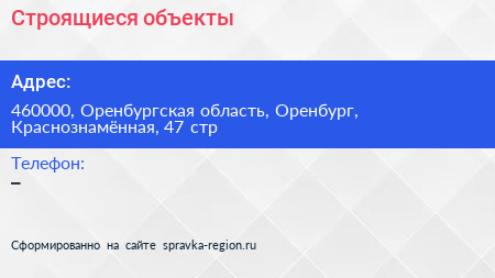 Строящиеся объекты по адресу 460000, Оренбургская область, Оренбург, Краснознамённая, 47 стр в дальнейшем Организация, размещена в следующих категориях: