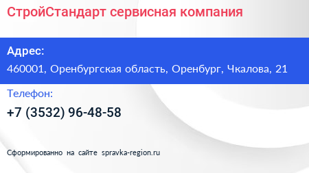 СтройСтандарт, сервисная компания по адресу 460001, Оренбургская область, Оренбург, Чкалова, 21 в дальнейшем Организация, размещена в следующих категориях: