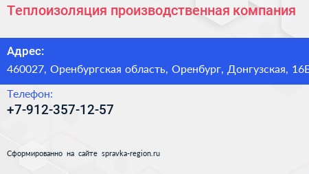 Теплоизоляция, производственная компания по адресу 460027, Оренбургская область, Оренбург, Донгузская, 16Б в дальнейшем Организация, размещена в следующих категориях: