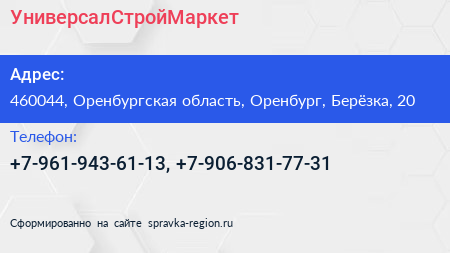 УниверсалСтройМаркет по адресу 460044, Оренбургская область, Оренбург, Берёзка, 20 в дальнейшем Организация, размещена в следующих категориях: