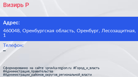 Визирь-Р по адресу 460048, Оренбургская область, Оренбург, Лесозащитная, 1 в дальнейшем Организация, размещена в следующих категориях: