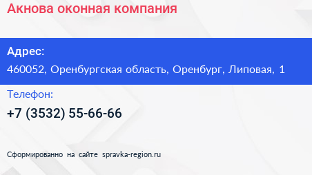 Акнова, оконная компания по адресу 460052, Оренбургская область, Оренбург, Липовая, 1 в дальнейшем Организация, размещена в следующих категориях: