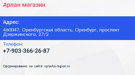 Арлан, магазин по адресу 460047, Оренбургская область, Оренбург, проспект Дзержинского, 27/2 в дальнейшем Организация, размещена в следующих категориях: