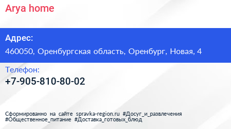 Arya home по адресу 460050, Оренбургская область, Оренбург, Новая, 4 в дальнейшем Организация, размещена в следующих категориях: