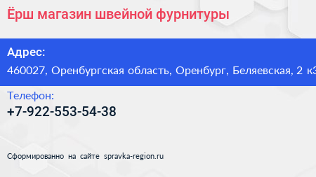 Ёрш, магазин швейной фурнитуры по адресу 460027, Оренбургская область, Оренбург, Беляевская, 2 к3 в дальнейшем Организация, размещена в следующих категориях: