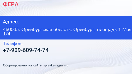 ФЕРА по адресу 460035, Оренбургская область, Оренбург, площадь 1 Мая, 1/4 в дальнейшем Организация, размещена в следующих категориях: