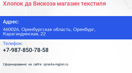 Хлопок да Вискоза, магазин текстиля по адресу 460026, Оренбургская область, Оренбург, Карагандинская, 22 в дальнейшем Организация, размещена в следующих категориях: