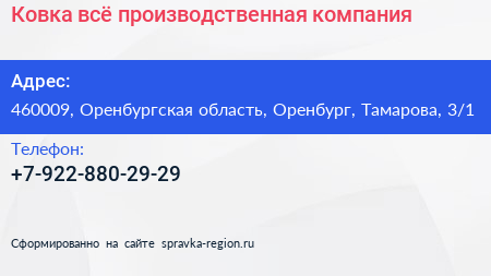 Ковка всё, производственная компания по адресу 460009, Оренбургская область, Оренбург, Тамарова, 3/1 в дальнейшем Организация, размещена в следующих категориях: