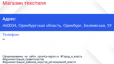Магазин текстиля по адресу 460034, Оренбургская область, Оренбург, Беляевская, 19 в дальнейшем Организация, размещена в следующих категориях: