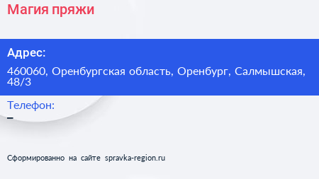 Магия пряжи по адресу 460060, Оренбургская область, Оренбург, Салмышская, 48/3 в дальнейшем Организация, размещена в следующих категориях: