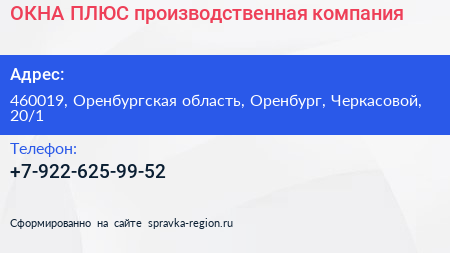 ОКНА ПЛЮС, производственная компания по адресу 460019, Оренбургская область, Оренбург, Черкасовой, 20/1 в дальнейшем Организация, размещена в следующих категориях: