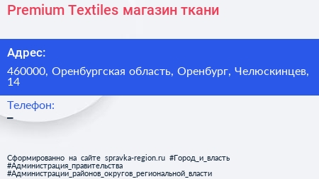 Premium Textiles, магазин ткани по адресу 460000, Оренбургская область, Оренбург, Челюскинцев, 14 в дальнейшем Организация, размещена в следующих категориях: