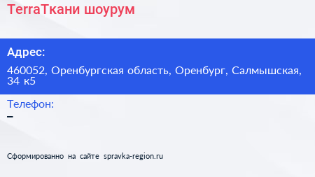 TerraТкани, шоурум по адресу 460052, Оренбургская область, Оренбург, Салмышская, 34 к5 в дальнейшем Организация, размещена в следующих категориях: