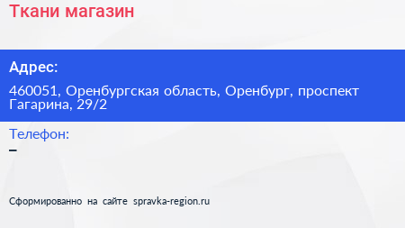 Ткани, магазин по адресу 460051, Оренбургская область, Оренбург, проспект Гагарина, 29/2 в дальнейшем Организация, размещена в следующих категориях: